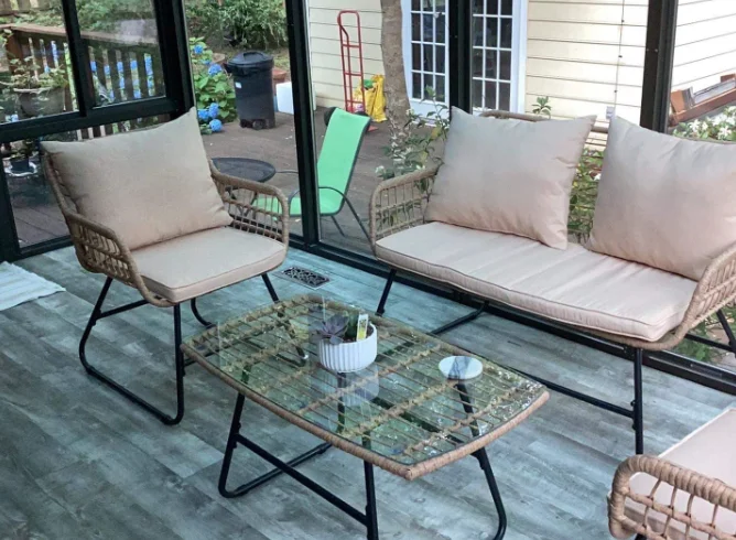 2 reviews for 4 Piece Patio Furniture Wicker Outdoor Bistro Set, Rattan Loveseat with Upholstery and Metal Table – AliExpress – Color : Light Brown black – Ships From : United States